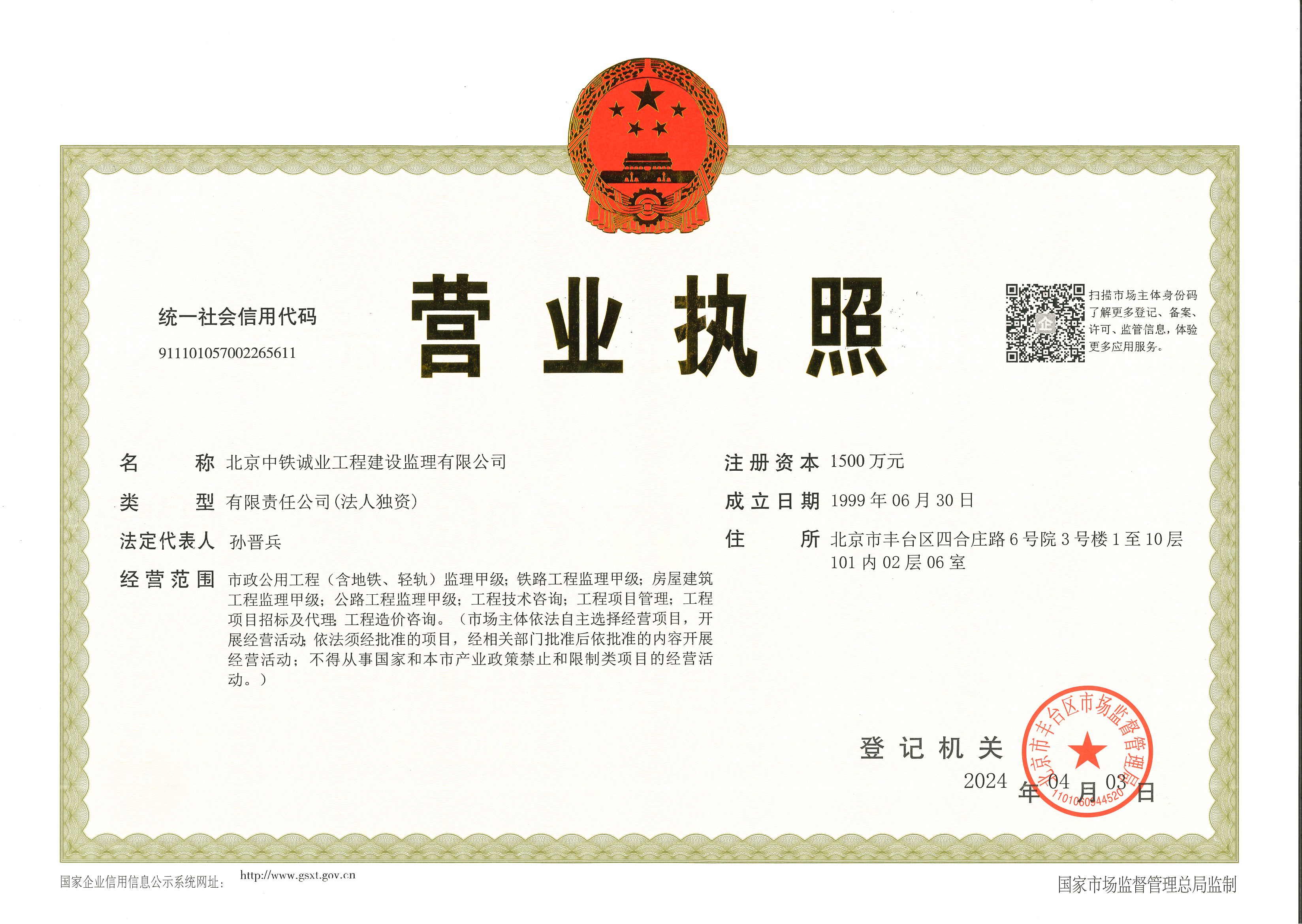 北京中铁诚业始终弘扬“勇于跨越、追求卓越”的企业精神,坚守 “专业、务实 、协作、创新”的企业合新价值观,秉承 “唯新、 唯勤、 唯诚 、唯实”的企业品格,诚信守誉,开拓创新,坚持以“监理工程质量合格率 100%,监理合同履约率 100%,监理工程无安全监理责任事故”为监理服务质量目标,勇当中国式现代化建设的“开路先锋”。