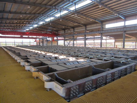 项目位于刚果民主共和国加丹加省,中铁咨询主要负责新建萃取-电积生产线的施工图设计任务,设计年产阴极铜25000t/a,设计采用了三萃一反萃取、不溶阳极电解生产阴极铜的冶炼工艺。项目于2012年完成“刚果(金)绿纱铜钴矿采选冶工程-铜萃取电积车间工程设计”的施工图设计工作,2013年实现一次试生产成功,产出第一批高纯阴极铜,并顺利达到了设计产能。