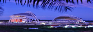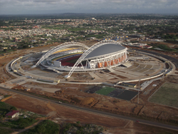体育场总占地面积33公顷,建筑面积36475m2,西看台钢结构罩棚拱顶高度63.8m,东看台钢结构罩棚拱顶高度48.1m。钢结构罩棚分东、西两片,分别由钢结构大拱架、外圈环行钢结构桁架、V形支撑柱和螺栓球节点网架组成。拱架拱脚与V形柱柱脚落地,与看台主体完全脱离。体育场最突出的是328m跨度的看台罩棚钢拱,其跨度及施工难度是目前非洲地区体育场之最。