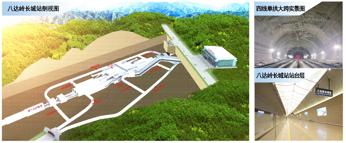 八达岭长城隧道地处八达岭核心风景区,全长12公里。八达岭长城站设在新八达岭隧道内,车站为三层三纵结构的复杂洞室群地下车站,相邻洞室最小水平间距2.2米、最小垂直间距4.5米,最大埋深102米,站隧过渡段为超大跨结构,最大跨度32.7米,地下部分建筑面积4万平方米。